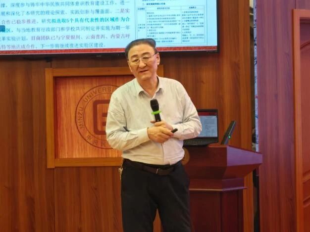 开题论证环节,项目首席专家苏德教授针对课题研究问题、研究框架、研究思路、预期成果及研究计划五个方面展开论述。他指出,课题将以“学校铸牢中华民族共同体意识教育理论与实践问题”为核心议题,围绕学校铸牢中华民族共同体意识教育的价值理念、实践现状、师生中华民族共同体意识发展水平、课程体系嵌入与区域实验改革五个层面,形成由理论逻辑到实践检验、由整体架构到区域探索的系统化问题链条。具体而言,理论层面剖析相关概念辩证关系,构建基于中华文明观的教育理论模型;实践层面聚焦教育现状,分析学段差异并构建测评体系,解决融入大中小学思政课一体化关键问题,探索区域推进策略与保障体系。综合运用多元研究方法,形成理论、实证与实践相统一的研究体系,解决“为什么教”“教得如何”“怎么教”“长效融入”问题,提供可复制的理论框架与操作范式。