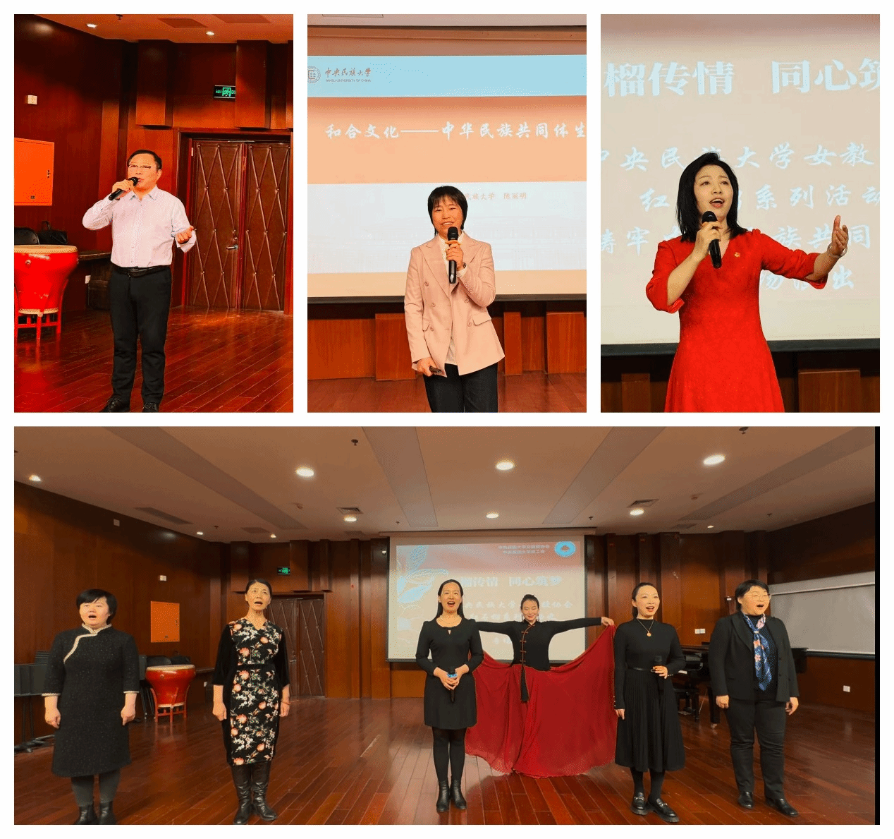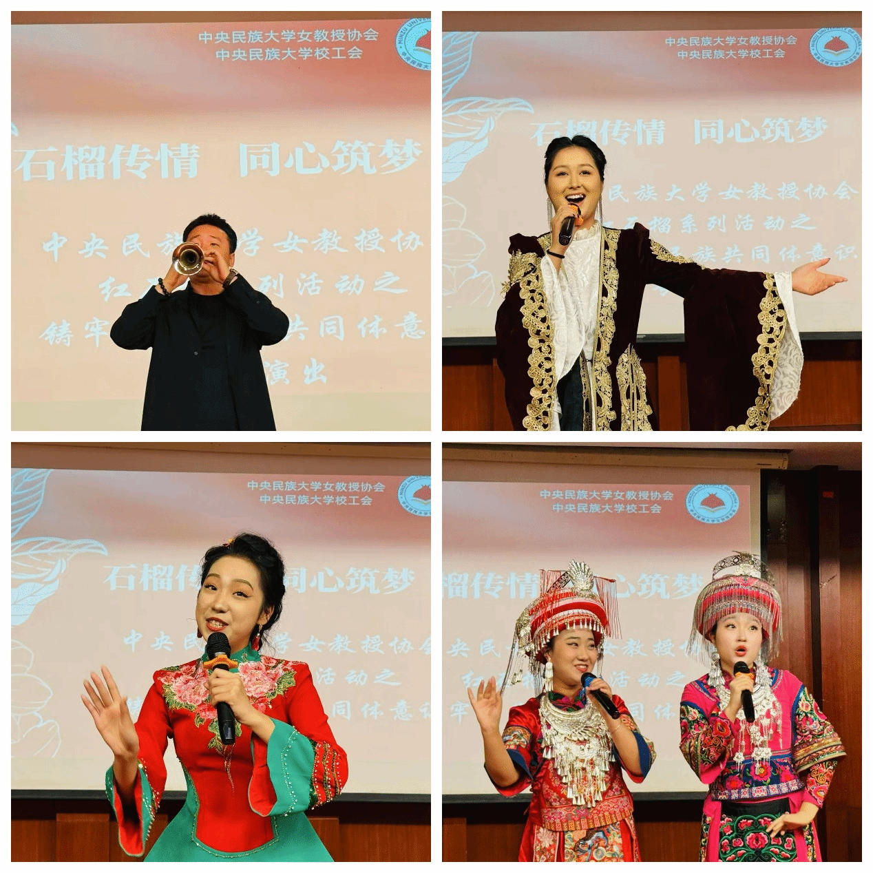 新闻网讯 为深入推进铸牢中华民族共同体意识教育,丰富校园文化生活,12 月 7 日下午,由中央民族大学校工会、女教授协会联合主办,音乐学院协办的 “石榴传情,同心筑梦——红石榴系列活动之铸牢中华民族共同体意识主题专场演出”,在中慧楼第三排练厅温情开演。校工会常务副主席宋玲、女教授协会会长刘明新、巡察办主任张肜肜、招生就业处处长赵丹华、舞蹈学院党委书记王淼、文学院党委书记张英等参加活动。校工会副主席赵丽红主持演出。来自学校各院系师生、校友代表齐聚一堂,在歌声与舞蹈中感受民族文化魅力,凝聚民族团结力量。