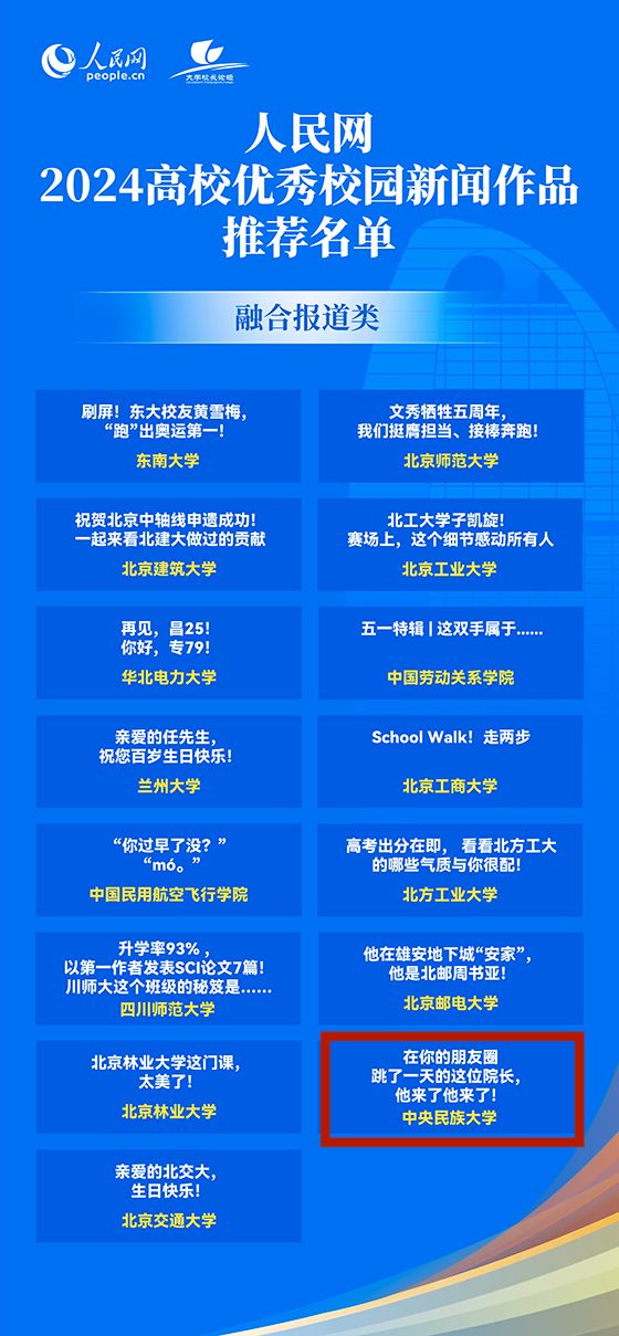 新闻网讯 12月27日,以“推进教育科技人才一体发展 加快建设教育强国”为主题的人民网2024大学校长论坛在北京人民日报社举行。论坛上,人民网2024年高校优秀校园新闻作品正式公布。中央民族大学官方微信公众号发布的《在你的朋友圈跳了一天的这位院长,他来了他来了!》一文入选人民网2024年高校优秀校园新闻作品(融合报道类)。